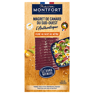 Dégustez un magret du Sud-Ouest, issu de canards nourri sans OGM. Fumé au bois de hêtre et préparé sans nitrite, il offre un goût raffiné et une texture fondante. Parfait en salade composée ou sur vos toasts apéritifs.