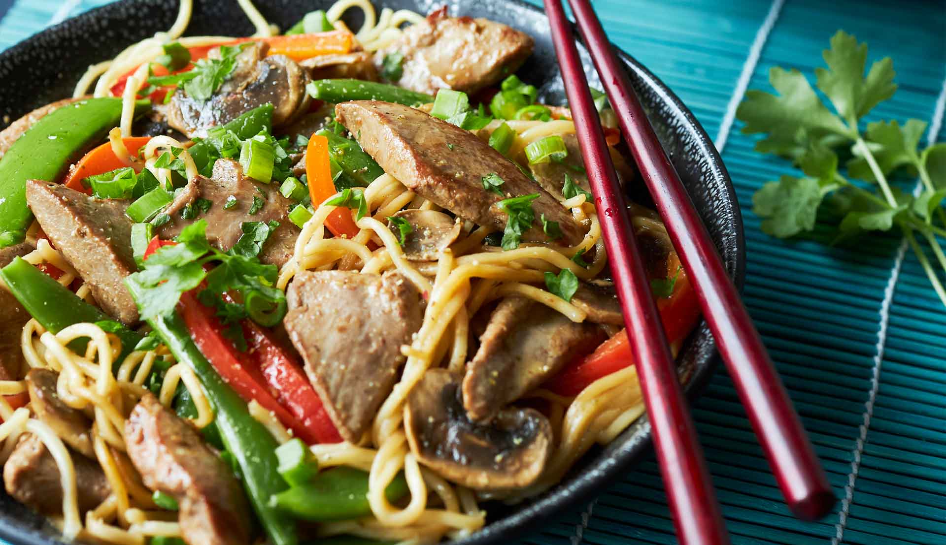 7. Faites de revenir les poids gourmands et le poivron dans le wok puis ajoutez les nouilles en remuant constamment.