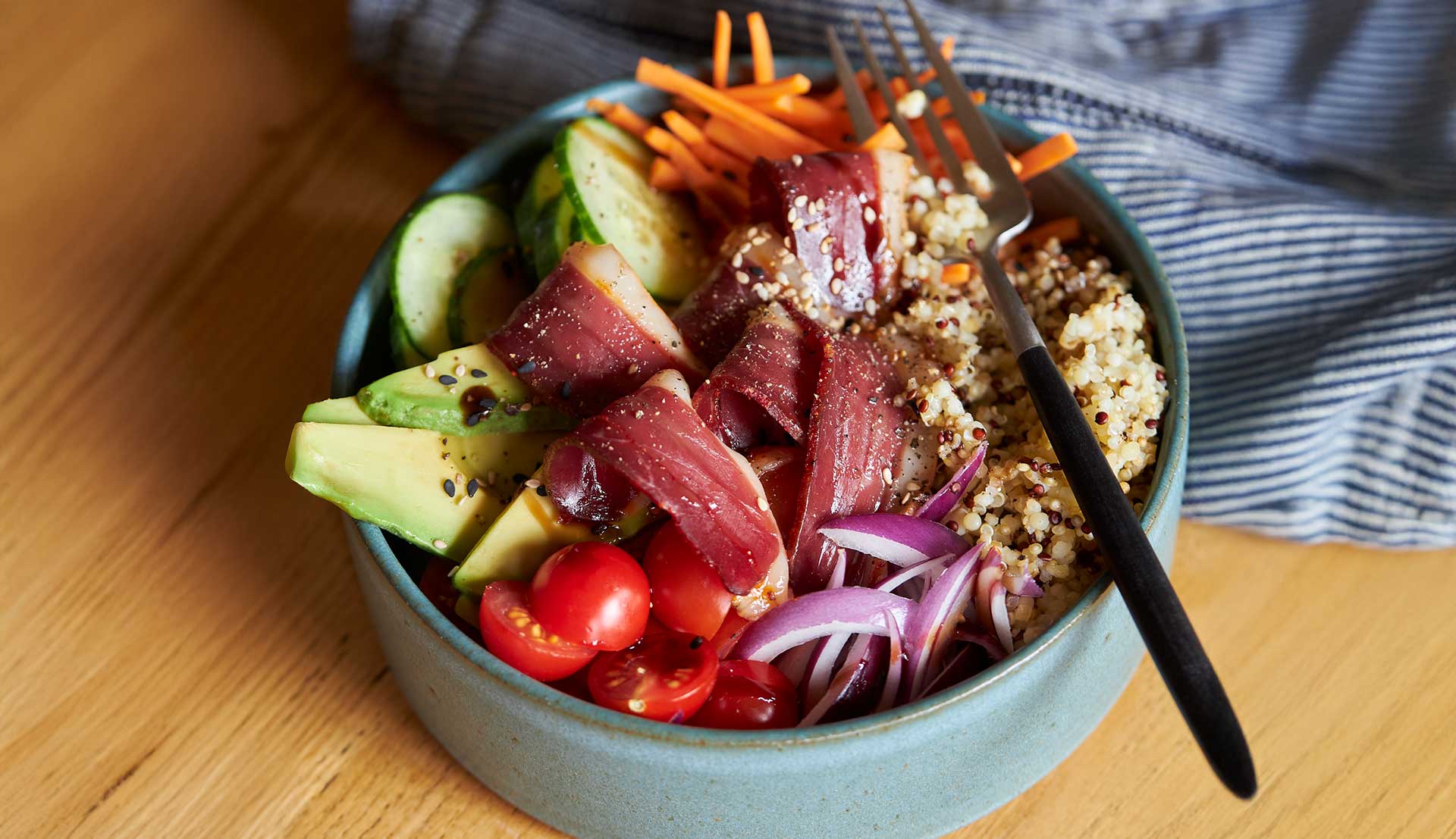 8. Ajoutez le quinoa, les oignons, les tomates, le magret, l’avocat, le concombre et les carottes.